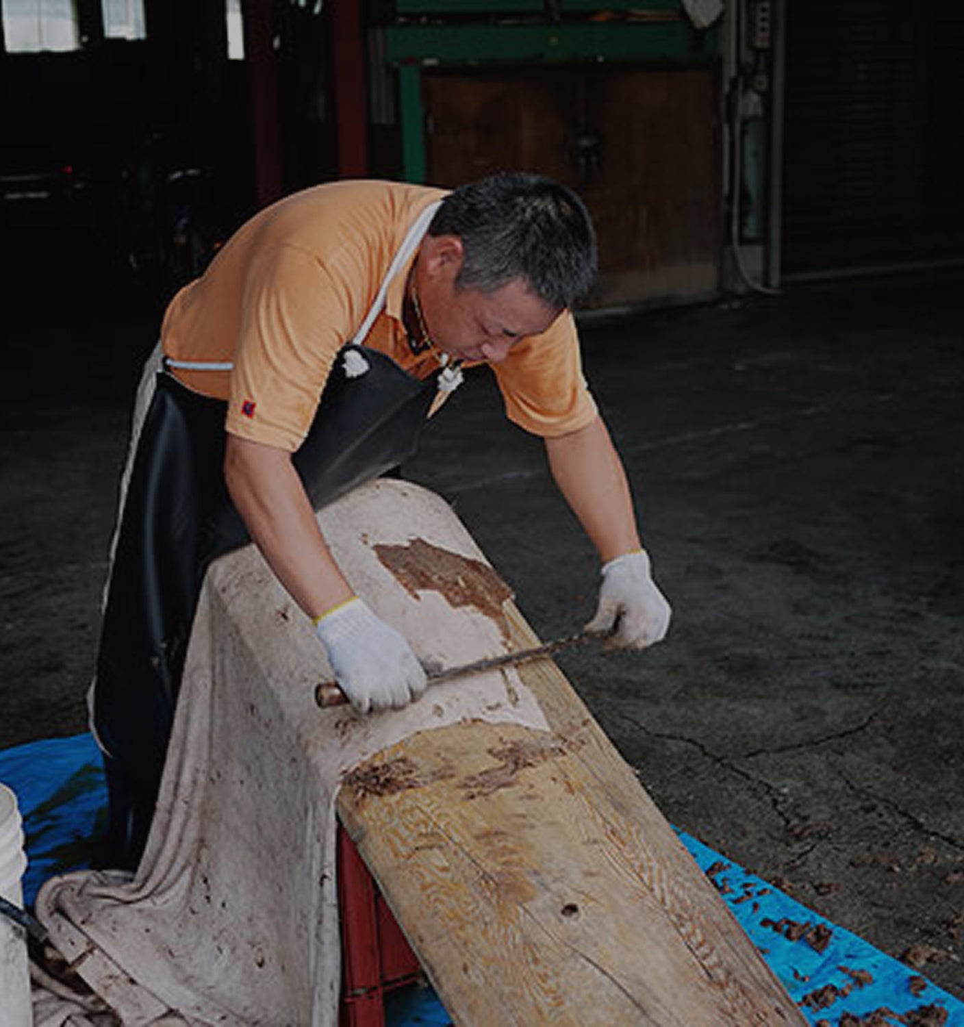 『ヌメ革といえば!』といわれるレシピを採用するために、イタリア製特殊ドラムを設置し100時間以上(クロム鞣しは約8時間)掛けたうえ、現地と同じ高濃度のタンニン剤を使用し、コストと時間をしっかりかけて丁寧に鞣したフルベジタブル鞣しを行うことで、ピット層鞣しにも負けない王道のヌメ革をご提案しています。